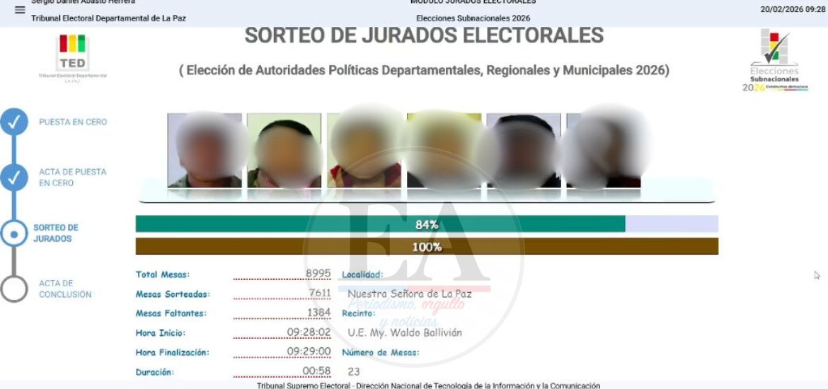El TSE informó que la nómina oficial de jurados será publicada el domingo 22 en listas oficiales, medios de comunicación y en la plataforma digital “Yo Participo”. En el departamento de Santa Cruz se prevé la designación de aproximadamente 53.000 jurados.