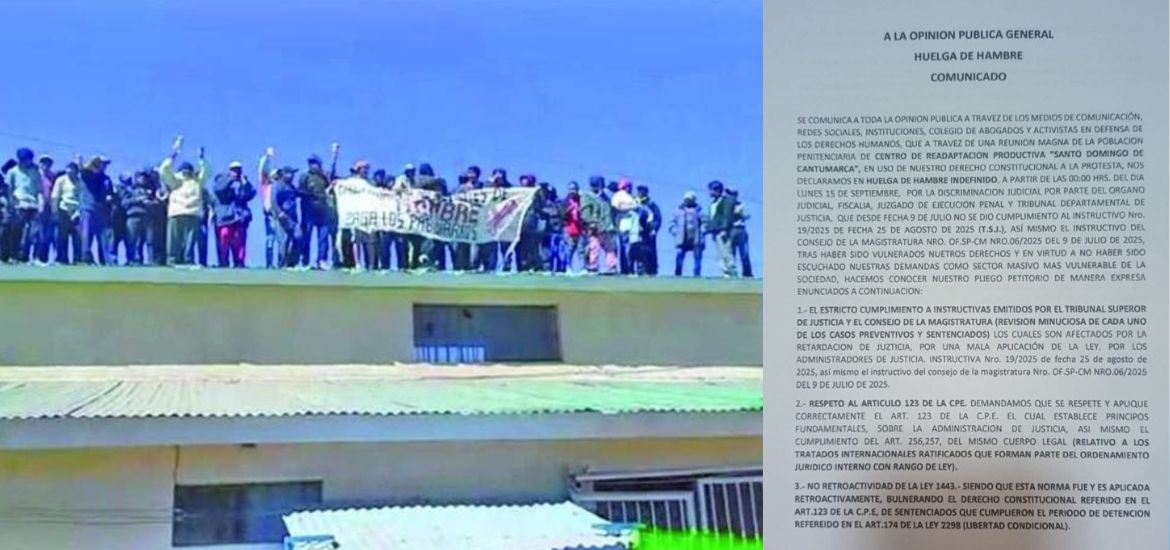 Desde la medianoche de este lunes, internos del penal de Cantumarca, en Potosí, comenzaron una huelga de hambre indefinida. La protesta está dirigida contra el Tribunal Departamental de Justicia, el Ministerio Público y el Juzgado de Ejecución Penal, a quienes acusan de discriminación y de no cumplir instructivos emitidos por el Tribunal Supremo de Justicia y el Consejo de la Magistratura.