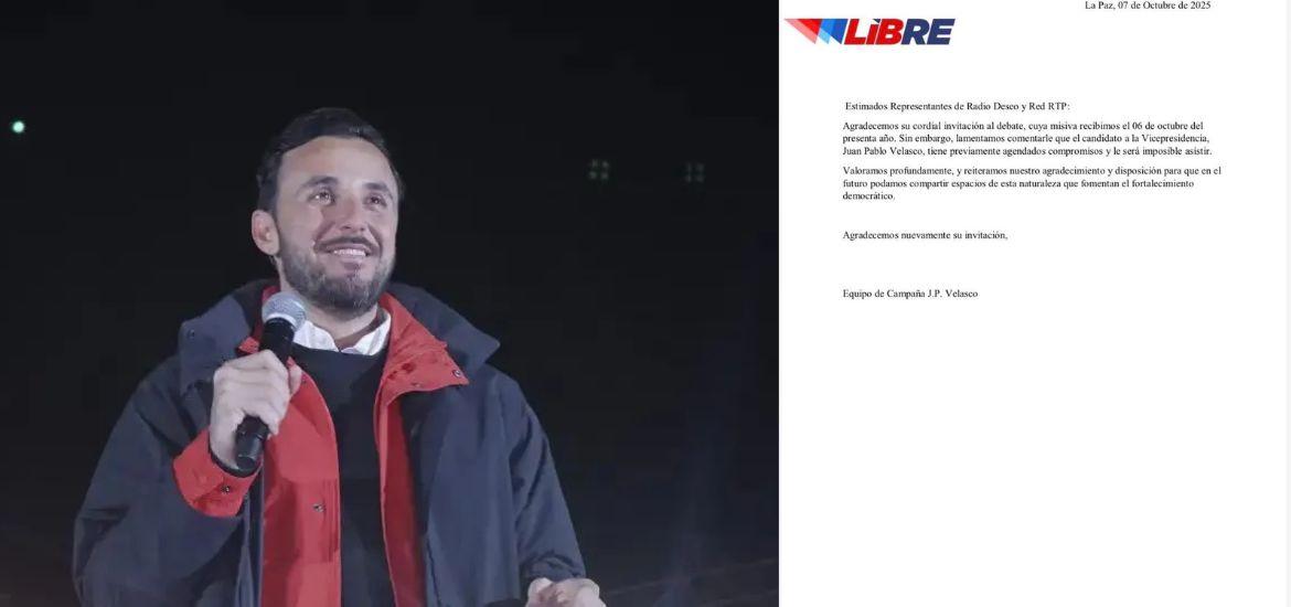 El candidato a la vicepresidencia por el partido LIBRE, Juan Pablo Velasco, no participará en el debate programado para este miércoles 8 de octubre, organizado por Radio Deseo y la red RTP.