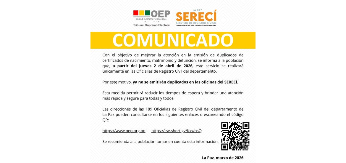 El Tribunal Supremo Electoral (TSE) anunció un cambio en la modalidad de entrega de duplicados de certificados de nacimiento, matrimonio y defunción en el departamento de La Paz, con el objetivo de mejorar la atención a la ciudadanía. Desde el 2 de abril, estos documentos dejarán de emitirse en...