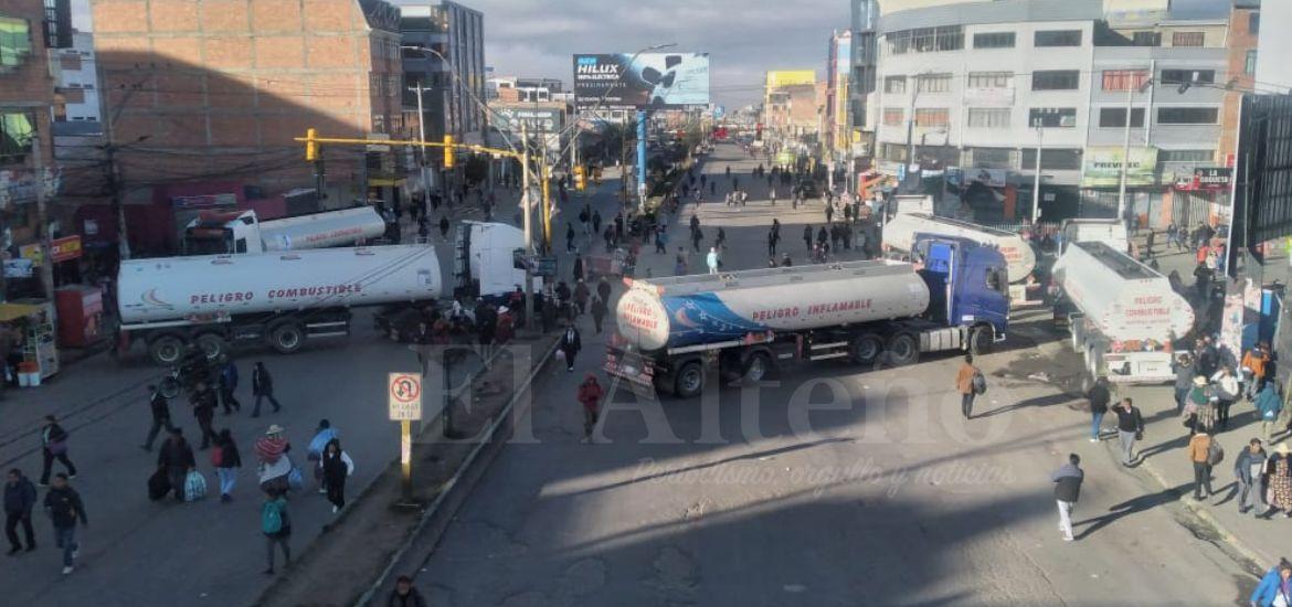 Un grupo de camiones cisterna instaló un bloqueo en el cruce a Viacha, sobre la avenida 6 de Marzo en El Alto, interrumpiendo la circulación vehicular en uno de los puntos clave de conexión.